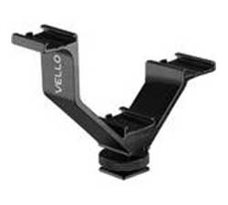 I can't think of more than two things you'd want on a shoe at the same time, but if you can think of something, then please be our guest, because there's room for three. It mounts onto the camera's shoe and in addition to the shoe mount, a 1/4"-20 thread is also available for attaching the bracket to a tripod, rig, or other bracket featuring a 1/4"-20-threaded mount. The accessory shoes also feature backstops for greater security when attaching accessories. The bottom shoe that attaches to the camera features a locking pin, which keeps the shoe in place and prevents it from rotating during use.
