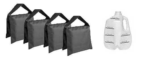 Before the cool LED fixtures became popular, we used to carry the heavy long cables needed for those heat-generating lights, along with the sandbags used to steady the tripods in our truck's 'jockey-boxes' mounted under the frame. We don't need them for this production package because our lights are cool and our sandbags are empty - but if you would like each one to weigh up to 20 pounds, just fill the bags with water - and we even provide a jug marked off properly, so you can get up to 10 pounds on each side.
